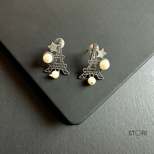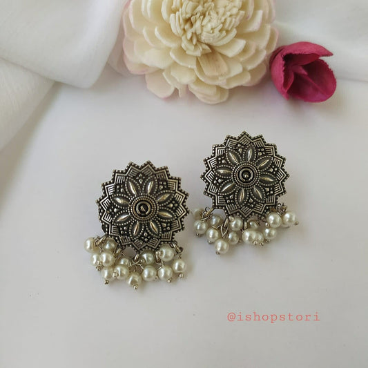 Sylvia Round Silver Look Alike Oxidised Earrings with Pearls