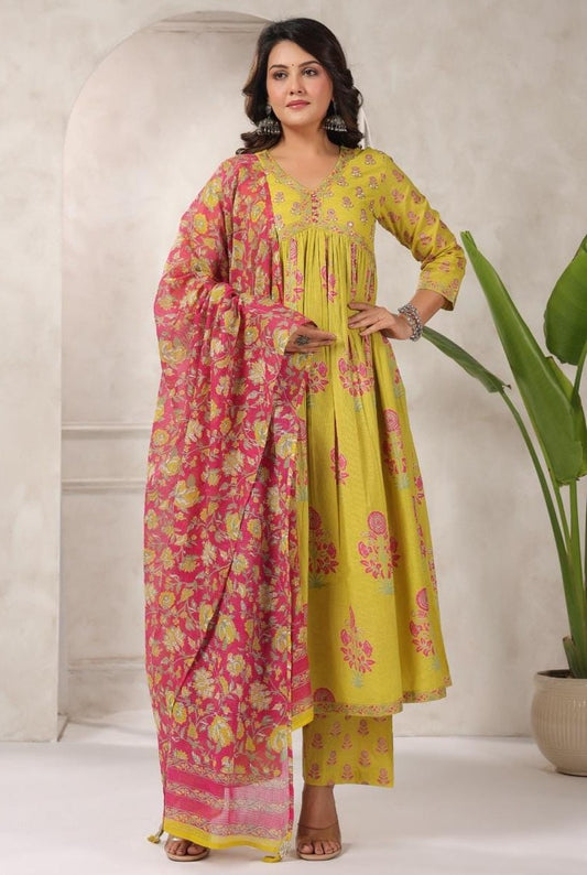 Niha Printed Floral Pink Cotton Mulmul Chikankari Kurti & Palazzo Set