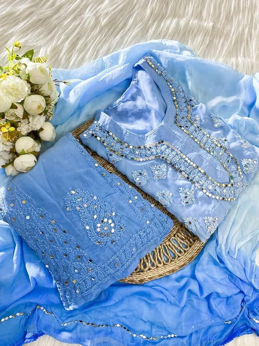 Blue Ombre Georgette Chikankari Kurti Palazzo Dupatta Set With Mirror Work