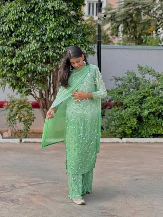 Pista Green Ombre Georgette Chikankari Kurti Palazzo Dupatta Set With Mirror Work