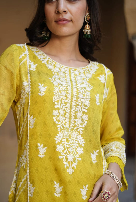 Butter Yellow Ombre Style Georgette Chikankari Kurti Palazzo Dupatta Set With Mirror Work