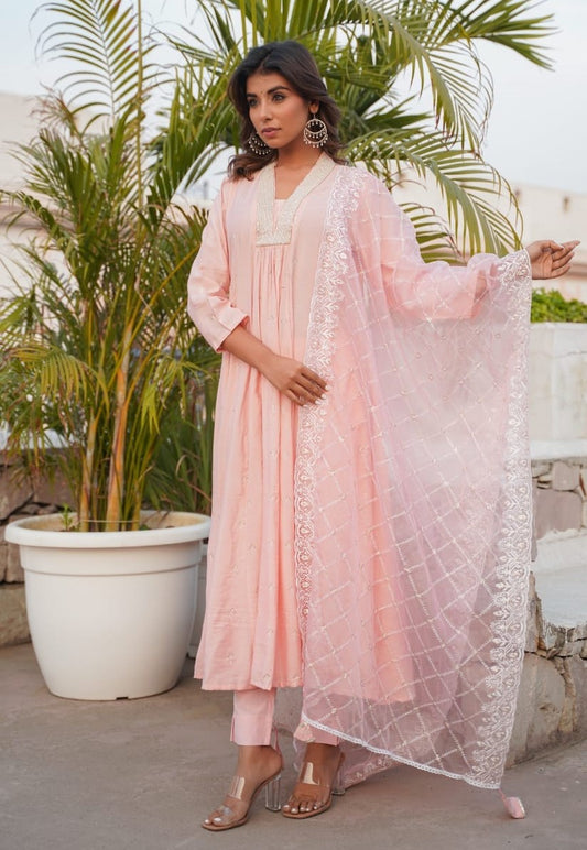 Peach Mul Silk Salwar Suit With Organza Dupatta