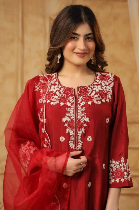 Deep Red Silk Kurti Set With Organza Dupatta