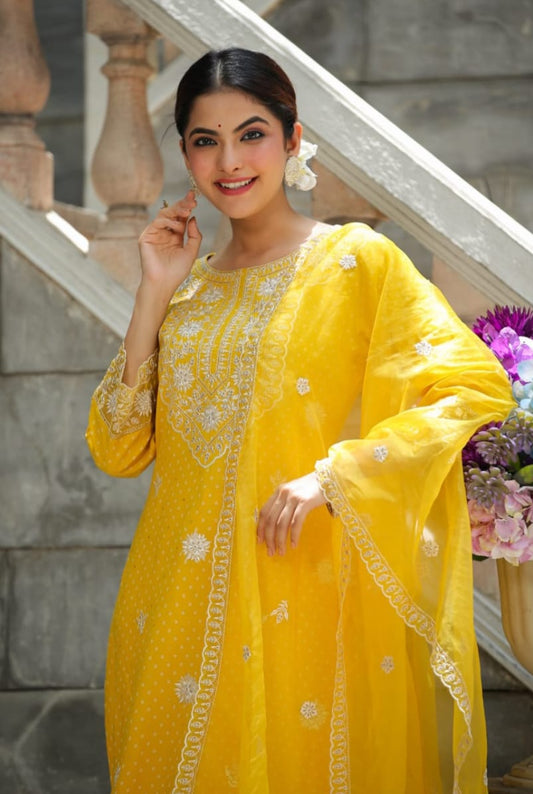 Butter Yellow Ombre Style Georgette Chikankari Kurti Palazzo Dupatta Set With Mirror Work
