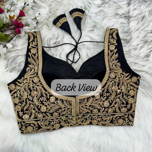 Black Heavy Zari Embroidered Designer Blouse With Elbow Sleeves