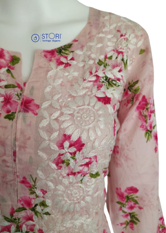 Floral Pink Cotton Mulmul Chikankari Kurti