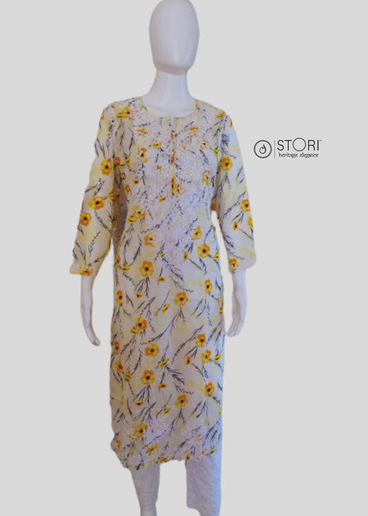 Floral Pale Yellow Printed Cotton Mulmul Chikankari Kurti
