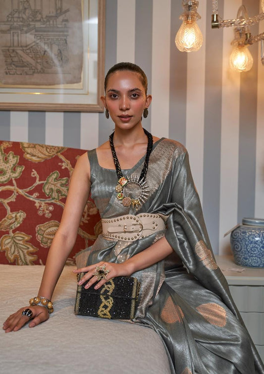 Stone Grey Copper Zari Woven Handloom Tussar Silk Saree