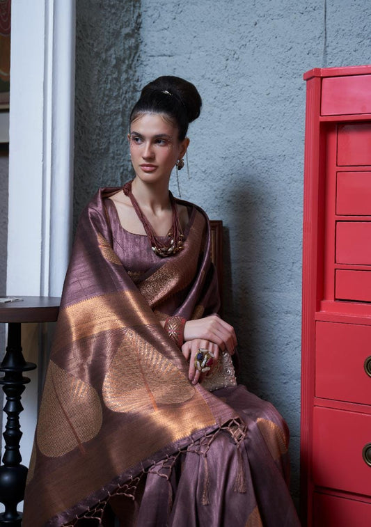 Resin Purple Copper Zari Woven Handloom Tussar Silk Saree