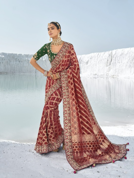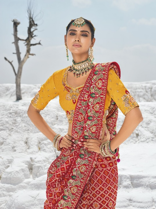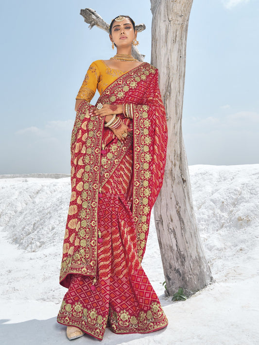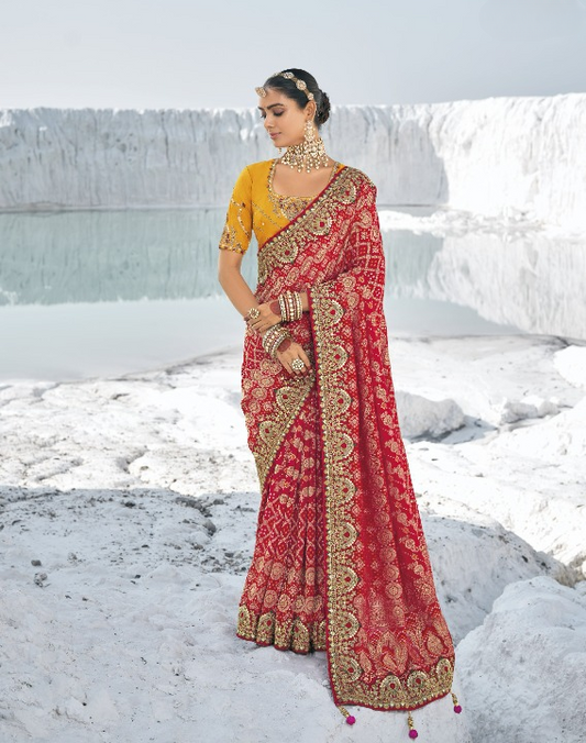 Tomato Red Bandhani Georgette Pure Silk Saree