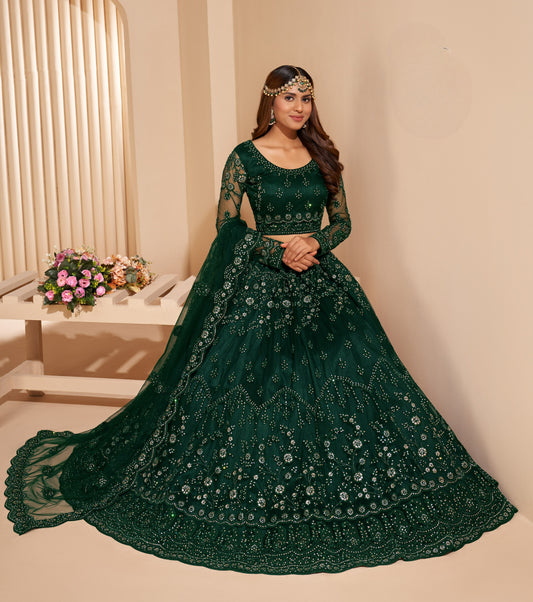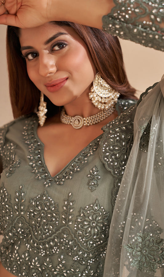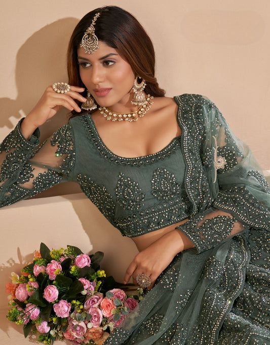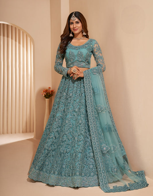 Dusty Turquoise Heavy Embroidered Net Lehenga