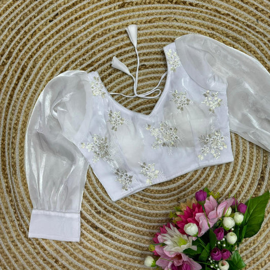 Blooming Organza V-Neck Blouse With Silver Zari Lace