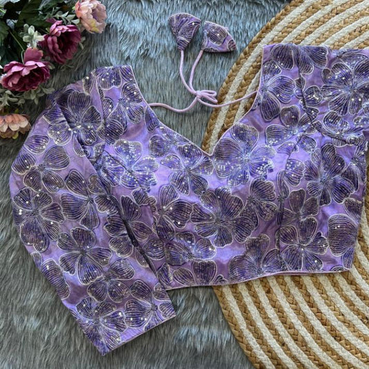Sequined Floral Printed Chinnon Silk Blouse With Long Sleeves
