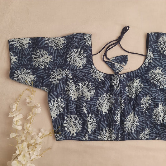Indigo Ajrakh Block Printed Boatneck Cotton Blouse - Plus Size
