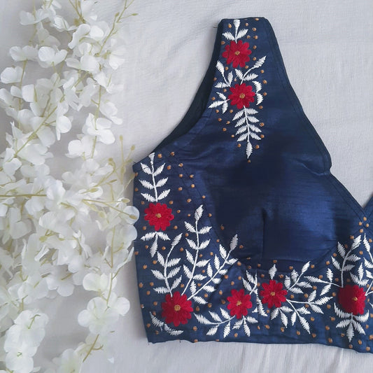Floral Embroidered Navy Blue Raw Silk Blouse