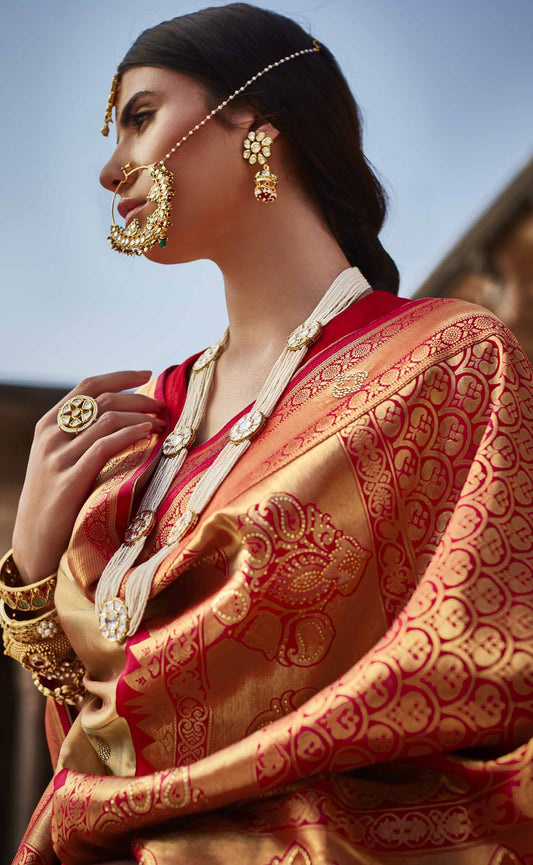 Golden Peach Silk Saree With Embroidered Designer Blouse