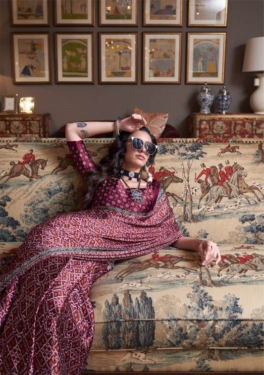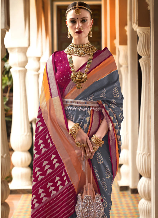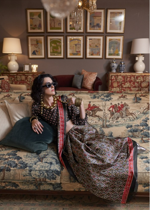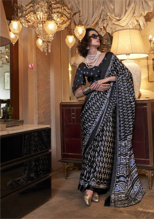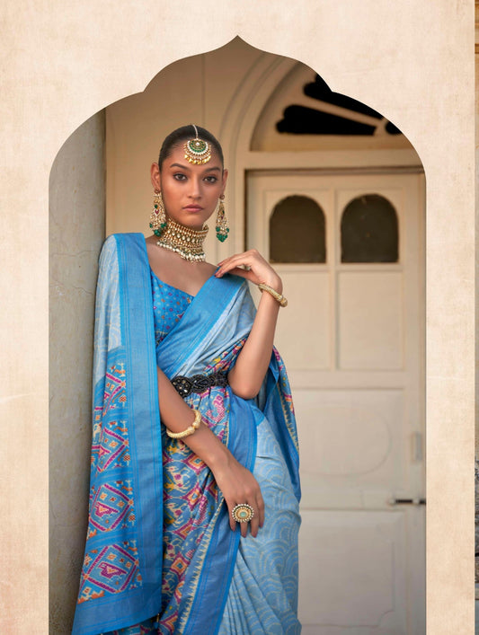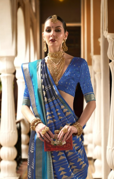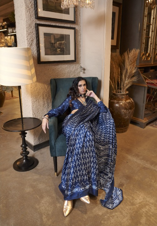 Indigo Blue Ikkat Printed Satin Crepe Silk Saree