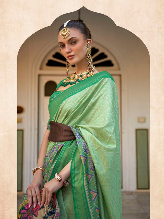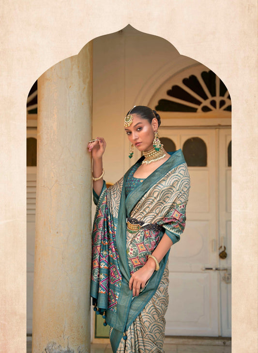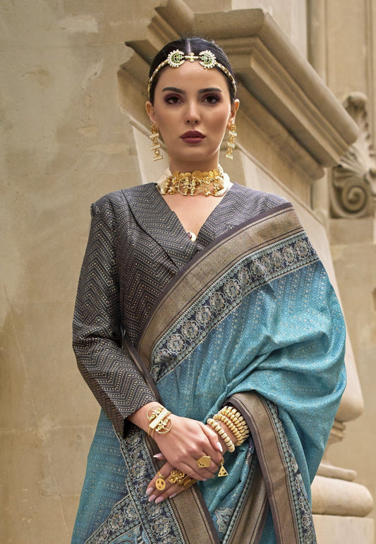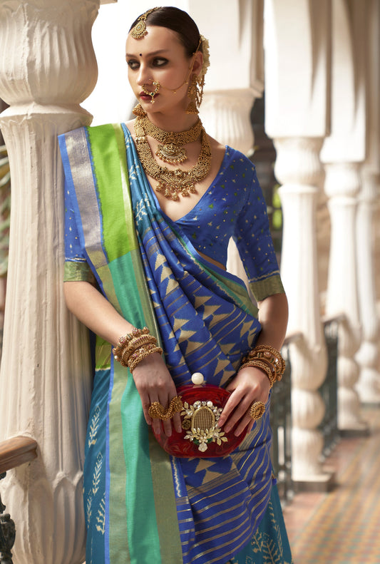 Rama Blue Silk Saree With Exotic Art Printed Border