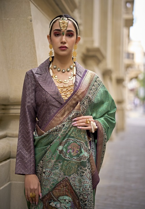 Green & Purple Silk Saree With Exotic Art Printed Border