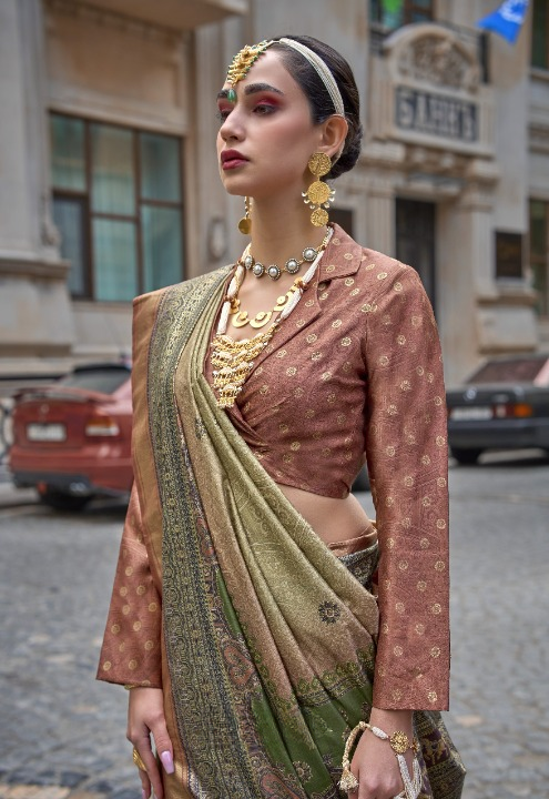 Green & Brown Silk Saree With Exotic Art Printed Border