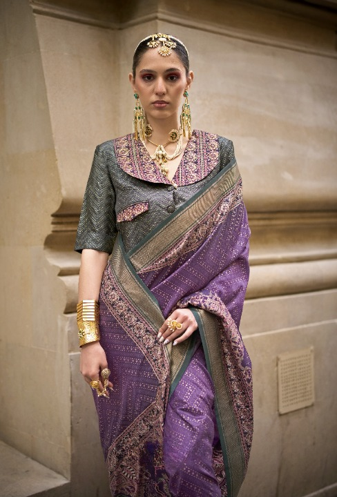 Purple & Grey Silk Saree With Exotic Art Printed Border