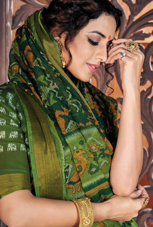 Dark Green Printed Handloom Cotton Saree