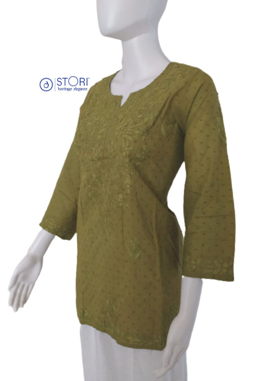Mehendi Green Dobby Cotton Short Chikankari Kurti