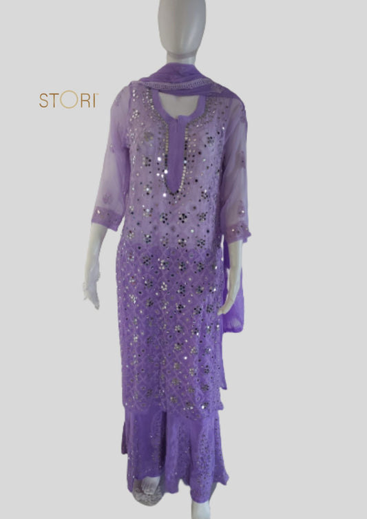 Lavender Ombre Style Georgette Chikankari Kurti Palazzo Dupatta Set With Mirror Work