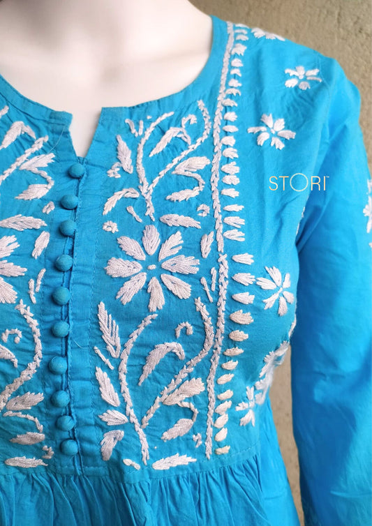 Sky Blue Flared Cotton Short Chikankari Kurti