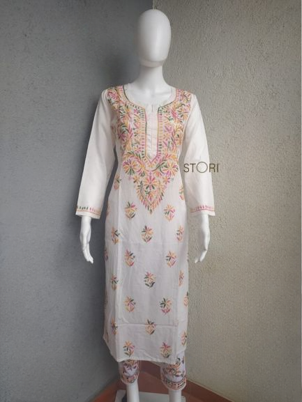 Avanya White Soft Cotton Chikankari Kurti With Multicolor Thread Embroidery
