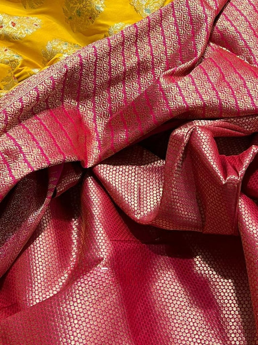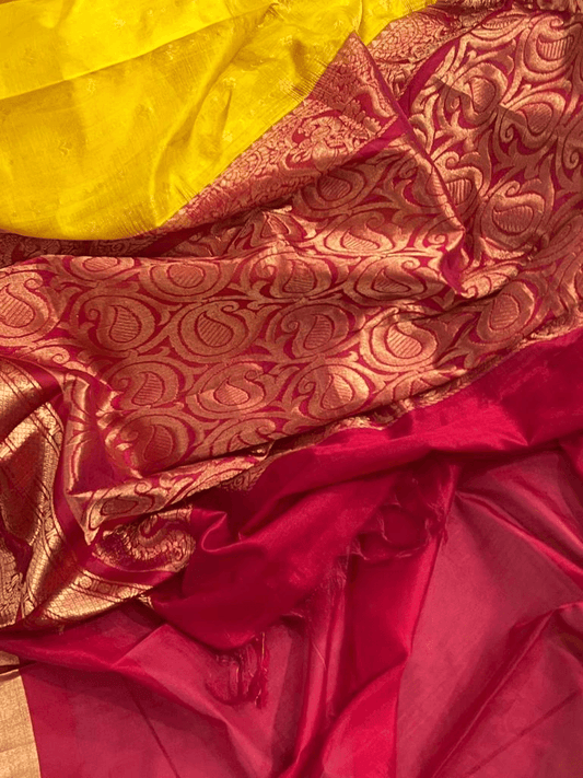 Bright Yellow Pure Silk Royal Kanchi Kuppadam With Red Blouse