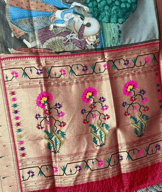 Greyish Olive Pure Dupion Silk Saree With Madhubani Prints & Paithani Muniya Border