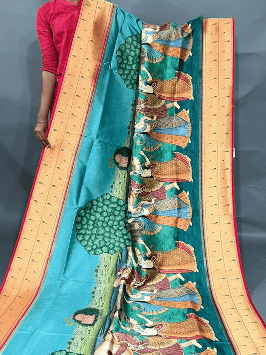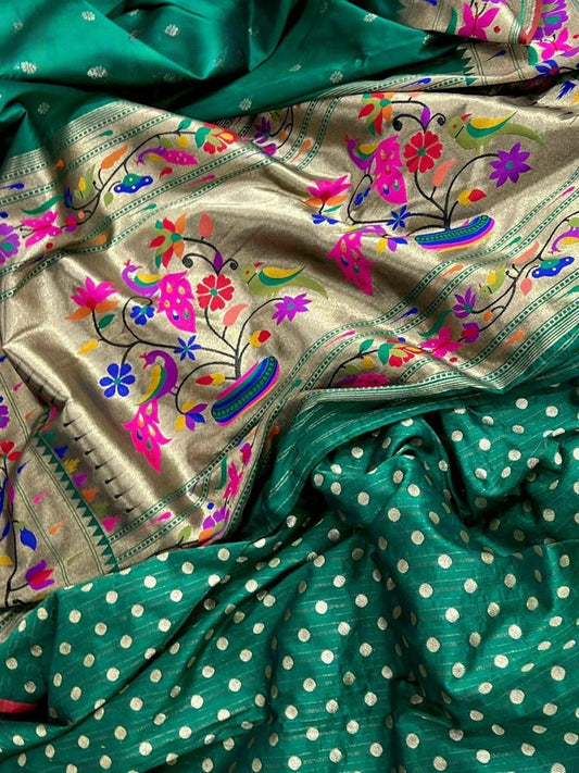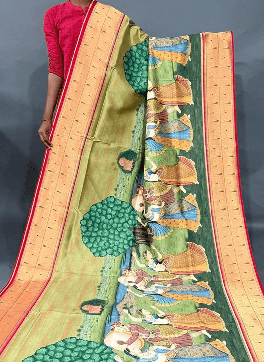 Green Pure Dupion Silk Saree With Madhubani Prints & Paithani Muniya Border