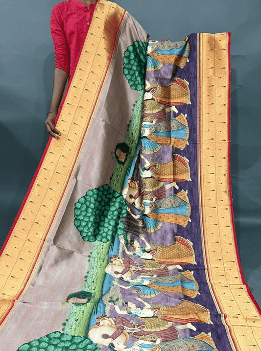 Light Mauve Pure Dupion Silk Saree With Madhubani Prints & Paithani Muniya Border
