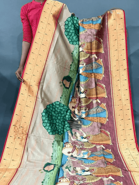 Beige Pure Dupion Silk Saree With Madhubani Prints & Paithani Muniya Border