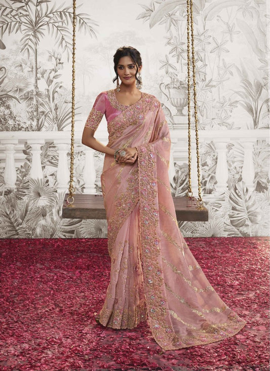 Blush Pink Heavy Embroidered Designer Silk Saree