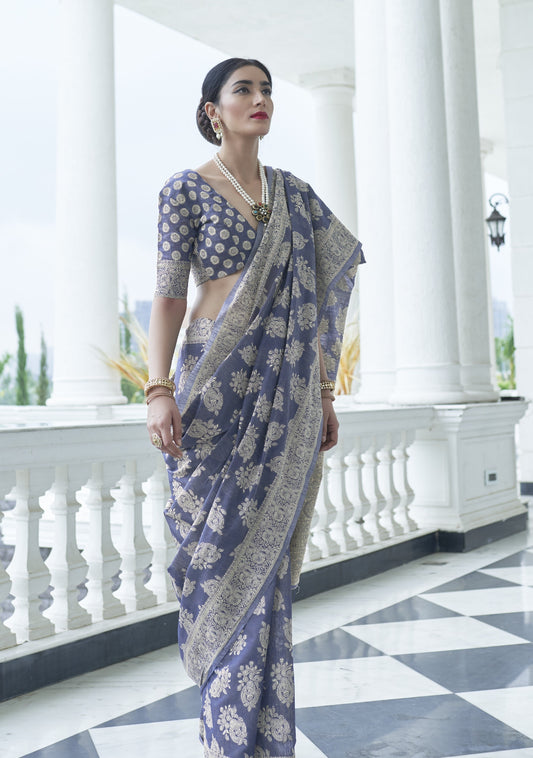 Bluish Grey Weaved Lucknowi Chikankari Saree
