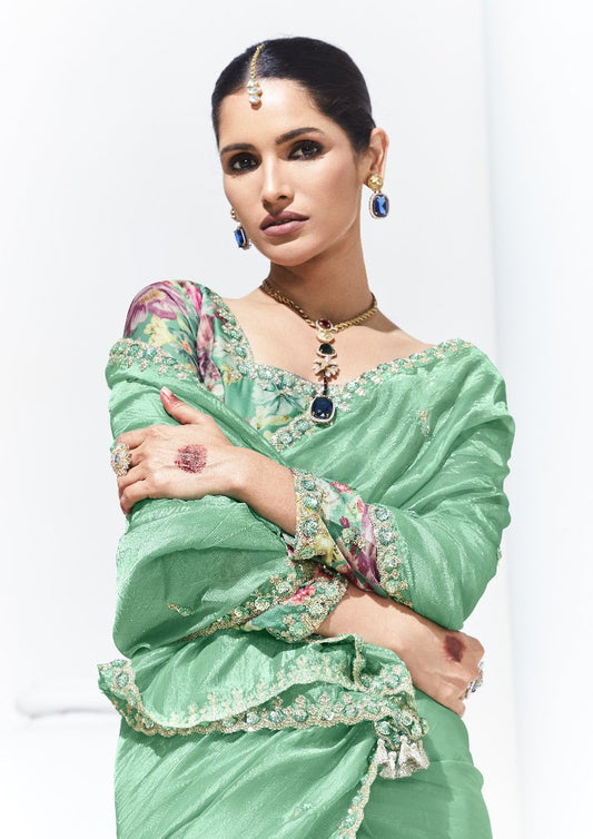 Mint Green Crush Tissue Silk Saree With Designer Blouse