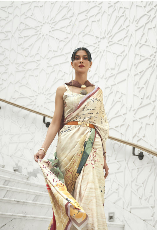 Off White Printed Kalamkari Satin Crepe Silk Saree