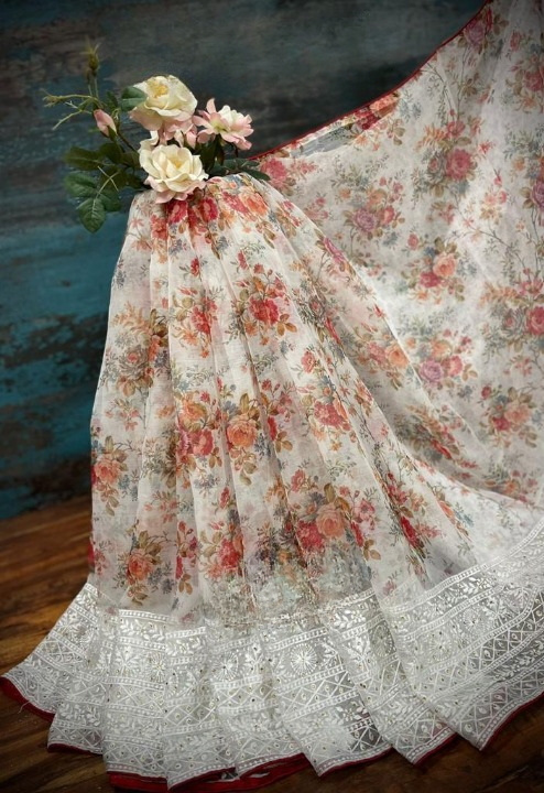 Floral Printed Organza Silk Saree With Chikankari Borders