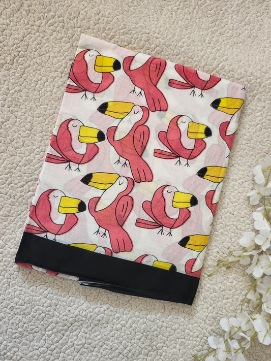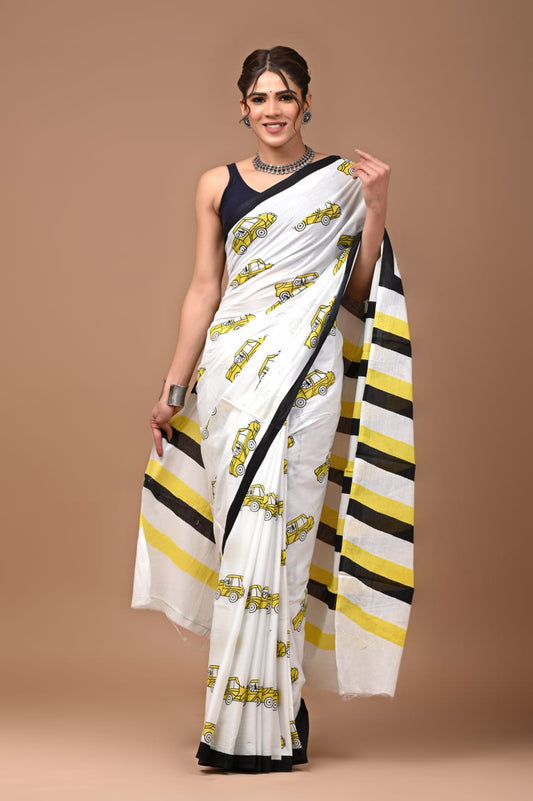 My Yellow Car Printed Handloom Cotton Mulmul Saree
