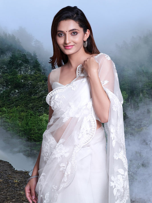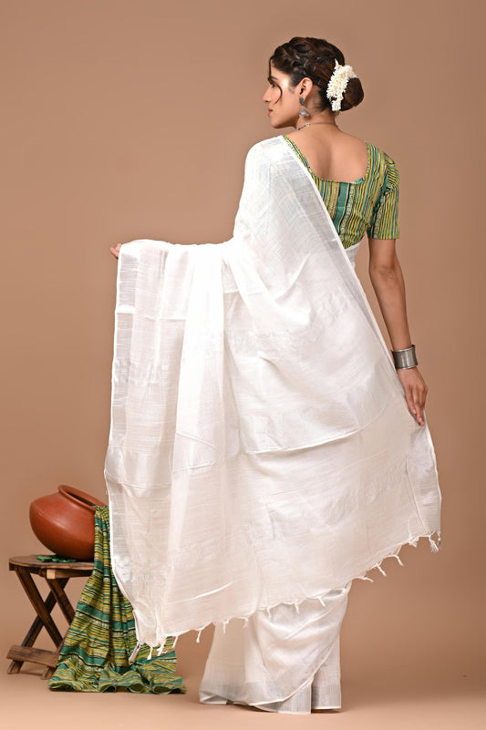 Pearl White Linen Saree With Extra Ajrakh Printed Blouse