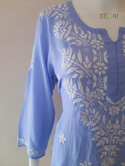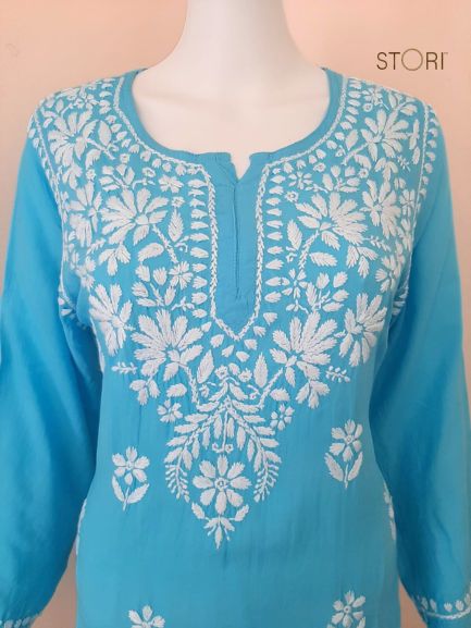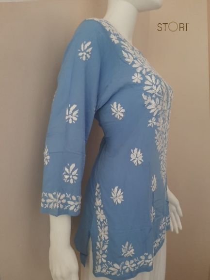 Aiza Sky Blue Soft Modal Handcrafted Short Chikankari Kurti