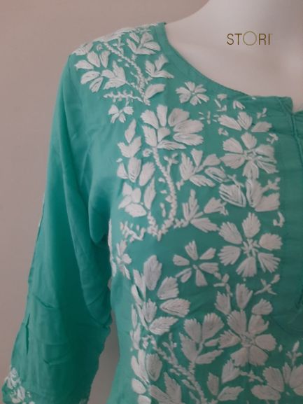 Aiza Seagreen Soft Modal Handcrafted Short Chikankari Kurti
