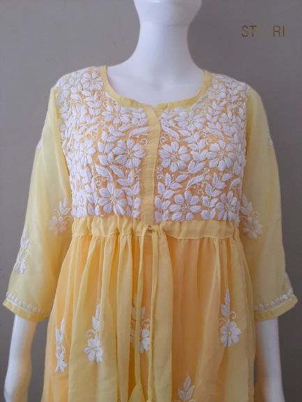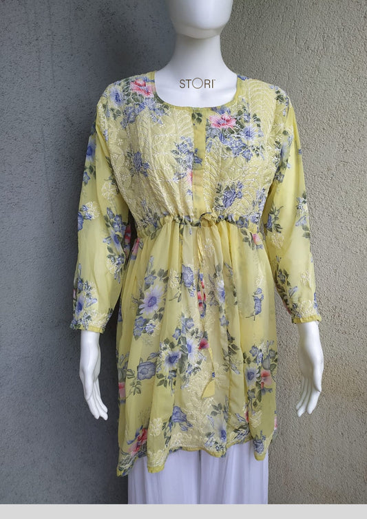 Butter Yellow Printed Floral Georgette Short Chikankari Kurti With Dori