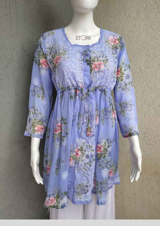 Lavender Printed Floral Georgette Short Chikankari Kurti With Dori