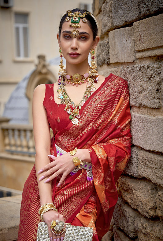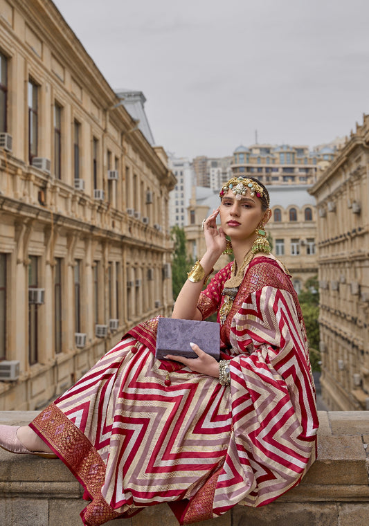 Red Banarasi Silk Saree With Chevron Stripes