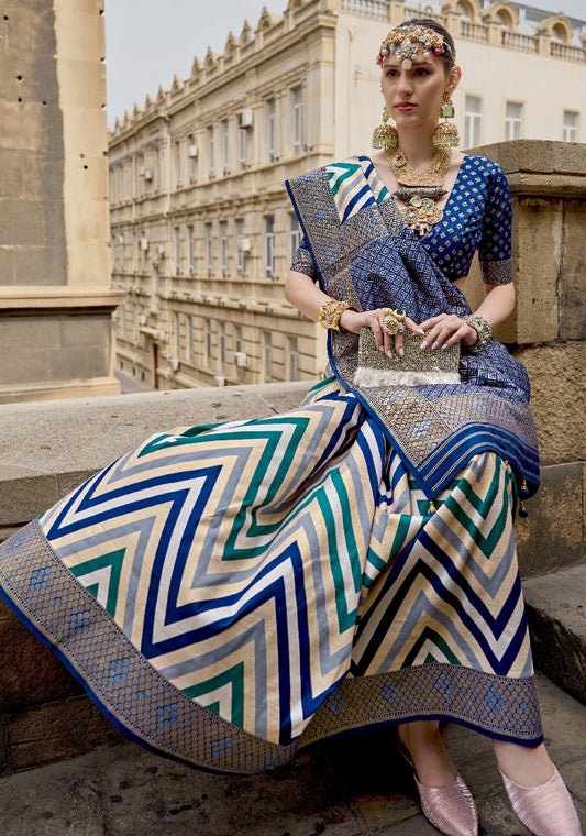 Blue Banarasi Silk Saree With Chevron Stripes