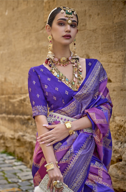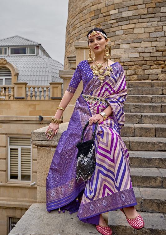 Purple Banarasi Silk Saree With Chevron Stripes
