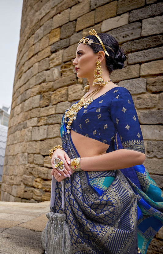 Tissue Blue Handloom Woven Silk Saree With Ikat Border